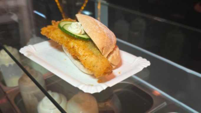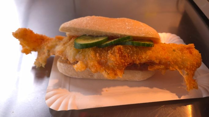 1. Backfischfilet im Baguette Brötchen 7,-